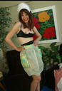 nylon panties, Under Angie's Maid Skirt: Shiny black bikini panties, slip, Under