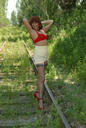Lauren is posing outside in her red panties, stockings, red bra and sexy girdle, when